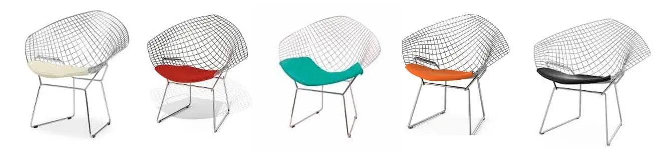 A cadeira diamante possui estrutura cromada nas linhas ca bertóia, seu formato se identifica com um pedra de diamante, razão que justifica o nome, geralmente é usada com assento e oferecido em diversas cores que podem harmonizar com a sua festa ou evento.